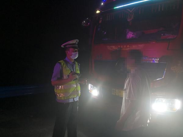 当日凌晨0时许,河南省高速交警总队三支队民警袁天顺、辅警余恒正在执行统一行动日巡逻任务,在京港澳高速公路595公里东半幅,荷宝高速转京港澳高速交汇地带,发现一辆晋B号牌的半挂货车停在路边应急车道上,没有开启危险报警闪光灯,车后也没有设置警示标志,民警立即停车例行检查。